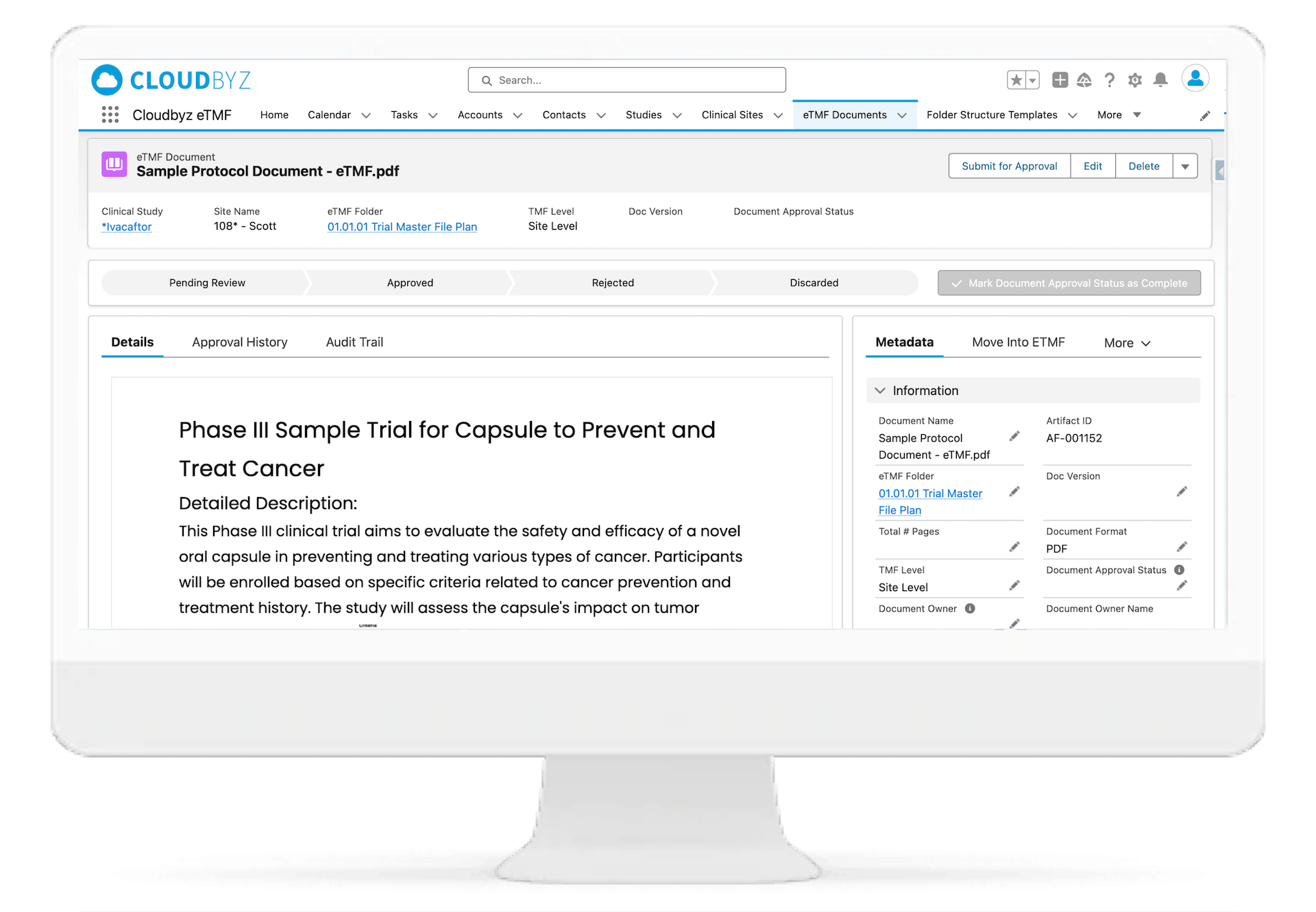 Cloudbyz eTMF software converts paper-based trial master files into electronic cloud-based model. Cloudbyz eTMF system is available along with Cloudbyz CTMS (Salesforce built). This eTMF systems enable CRO, sponsors and sites to better manage clinical trial master files (generated during clinical trials) with multi-gadget configurability.